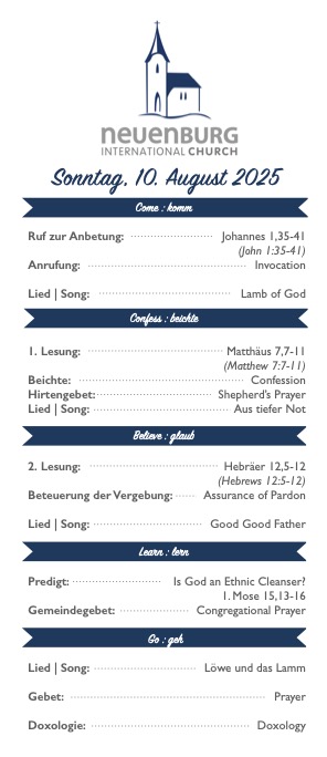 Feiert diese Woche gemeinsam mit uns Gottesdienst. Um 10:00 Uhr bieten wir einen Gottesdienst für alle Interessierten an. Der Gottesdienst wird sowohl in deutscher als auch in englischer Sprache abgehalten. Wir hoffen, euch dort zu sehen!