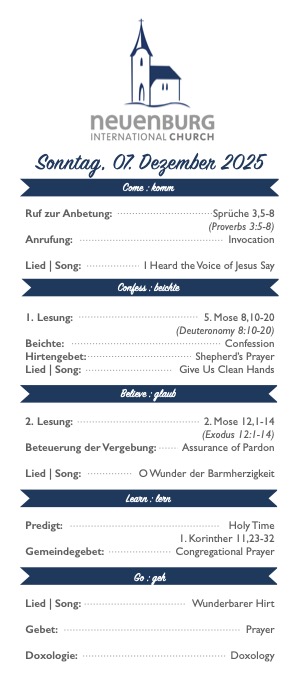 Feiert diese Woche gemeinsam mit uns Gottesdienst. Um 10:00 Uhr bieten wir einen Gottesdienst für alle Interessierten an. Der Gottesdienst wird sowohl in deutscher als auch in englischer Sprache abgehalten. Wir hoffen, euch dort zu sehen!