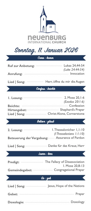 Feiert diese Woche gemeinsam mit uns Gottesdienst. Um 10:00 Uhr bieten wir einen Gottesdienst für alle Interessierten an. Der Gottesdienst wird sowohl in deutscher als auch in englischer Sprache abgehalten. Wir hoffen, euch dort zu sehen!