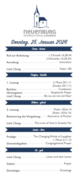 Feiert diese Woche gemeinsam mit uns Gottesdienst. Um 10:00 Uhr bieten wir einen Gottesdienst für alle Interessierten an. Der Gottesdienst wird sowohl in deutscher als auch in englischer Sprache abgehalten. Wir hoffen, euch dort zu sehen!