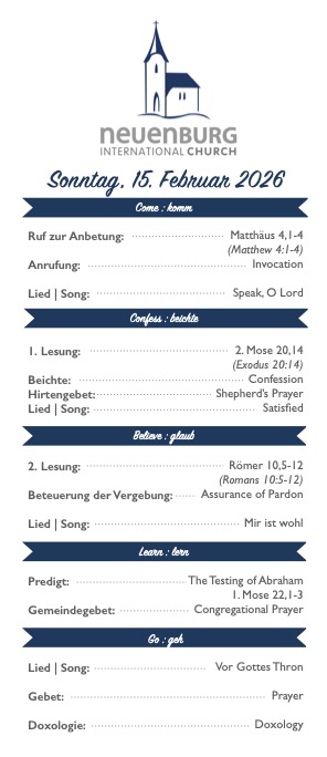 Feiert diese Woche gemeinsam mit uns Gottesdienst. Um 10:00 Uhr bieten wir einen Gottesdienst für alle Interessierten an. Der Gottesdienst wird sowohl in deutscher als auch in englischer Sprache abgehalten. Wir hoffen, euch dort zu sehen!