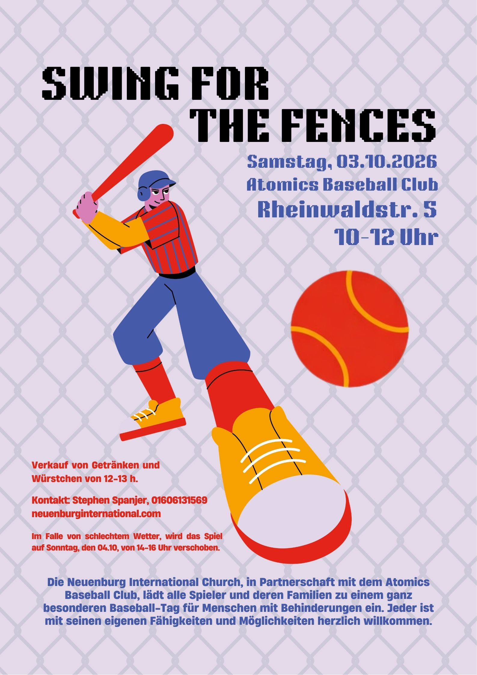 Jedes Jahr veranstaltet die Neuenburg International Church in Zusammenarbeit mit dem Neuenburg Atomics Baseball Club einen speziellen Baseballtag für Menschen mit Behinderungen. Alle Spielstärken sind willkommen. Wir spielen ein Spiel und grillen danach. Unten siehst einige Bilder aus den vergangenen Jahren. Wir freuen uns auf Swing for the Fences 2026, das am 03. Oktober stattfinden wird.